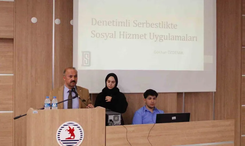 SOSYAL HİZMET BÖLÜMÜ TARAFINDAN GERÇEKLEŞTİRİLEN "DENETİMLİ SERBESTLİKTE SOSYAL HİZMET UYGULAMALARI" KONULU KONFERANSTA, DENETİMLİ SERBESTLİK SÜRECİNDE SOSYAL HİZMETİN ROLÜ, BİREYLERİN TOPLUMA KAZANDIRILMASI VE PSİKO-SOSYAL DESTEK MEKANİZMALARI ELE ALINDI.