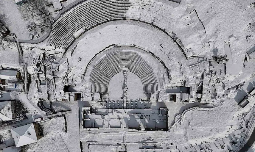 Antik kentin sütunları, tiyatro kalıntıları ve diğer tarihi yapıları karla kaplanırken, beyaz örtü geçmişle bugünü bir araya getiren görsel bir şölen sundu.