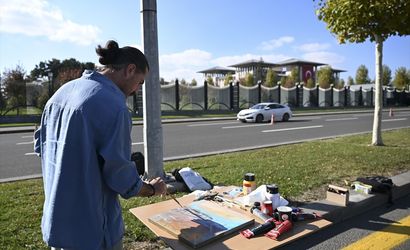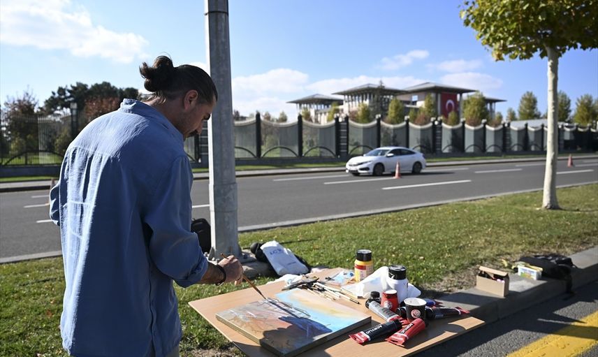 Başkentte ressamlar, 29 Ekim Cumhuriyet Bayramı kutlamaları kapsamında, Cumhurbaşkanlığı Külliyesi önünde düzenlenen sıcak hava balonu etkinliğini resmetti.
