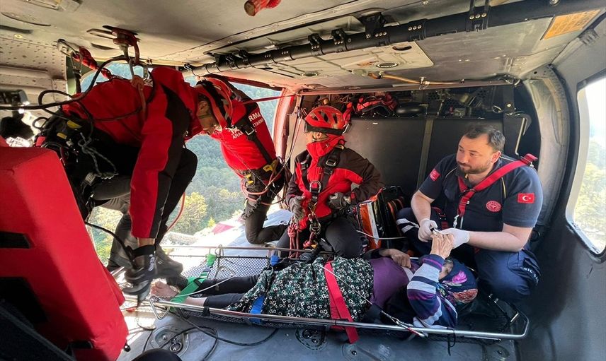 Rize'nin Ardeşen ilçesindeki Nolaşkari Yaylası'nda sel nedeniyle mahsur kalan ve ayağında rahatsızlığı bulunan 80 yaşındaki Selime Ayçiçek, askeri helikopterle kurtarılarak hastaneye kaldırıldı.