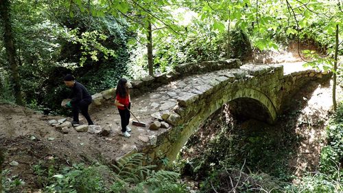 Rize'nin Hemşin ilçesinde Serdar ve Betül Abay, tarihi köprüyü yabani otlardan arındırarak güzelliğini ortaya çıkardı.