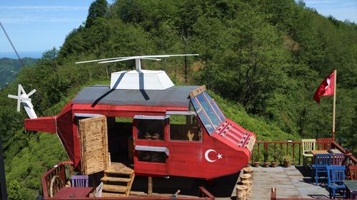 Rize'nin Çayeli ilçesine bağlı Derecik köyünde, çay bahçesinde yer alan helikopter şeklindeki ahşap yapı, ziyaretçilerden büyük ilgi görüyor. İşletmeci Sedat Şimşek ve dört arkadaşı, yaklaşık üç ay süren çalışmanın ardından bu ilginç yapıyı inşa etti. İçerisinde oturma alanı bulunan ve…