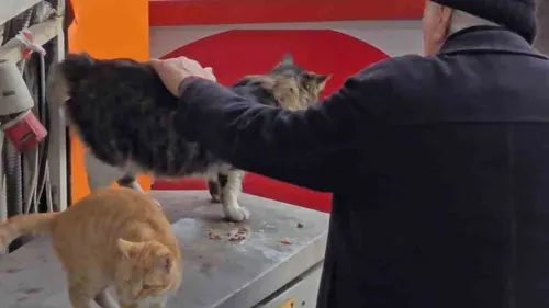 Karabük'ün Safranbolu ilçesinde ismi öğrenilemeyen bir yaşlı adam, Sadri Artunç Caddesi'nde sokak kedilerini elleriyle besleyerek izleyenlerin yüreğini ısıttı.