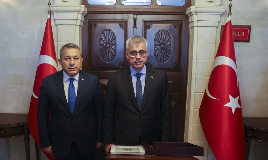 Sağlık Bakanı Kemal Memişoğlu (sağda), çeşitli etkinliklere katılmak için geldiği Kilis'te Vali Tahir Şahin'i (solda) ziyaret etti.