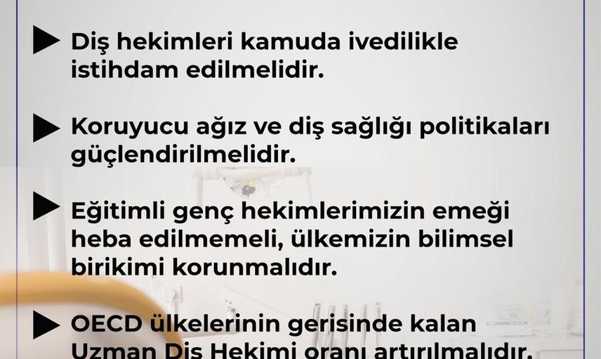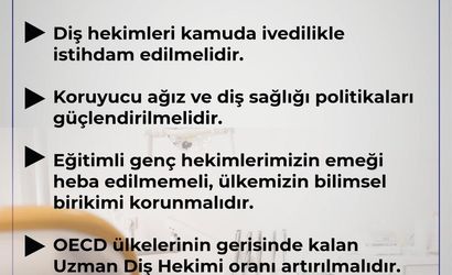 - Kamuda diş hekimi istihdamının artırılması: Genç mezunların kamuda değerlendirilmesi ve atama süreçlerinin hızlandırılması gerektiği belirtildi.