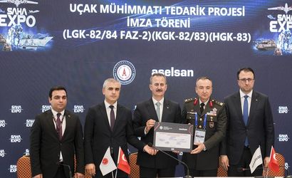 Türkiye'nin ve Avrupa'nın en büyük sanayi kümelenmesi SAHA İstanbul tarafından Cumhurbaşkanlığı himayesinde organize edilen, 6 bakanlık ve Cumhurbaşkanlığı Savunma Sanayii Başkanlığının (SSB) desteklediği, Anadolu Ajansının (AA) global iletişim ortağı olduğu SAHA EXPO Savunma, Havacılık ve Uzay Sanayi Fuarı devam ediyor. Fuarda kurumlar arasında çok sayıda işbirliği anlaşması da imzalanıyor. Cumhurbaşkanlığı Savunma Sanayii Başkanlığı (SSB), ASELSAN ve Roketsan arasında 'HİSAR ve SİPER İlave Batarya Alımı Sözleşmesi' de fuarın ikinci gününde imzalandı. Törene SSB Başkanı Haluk Görgün (sol 3) ile sözleşme paydaşı kurumların yöneticileri katıldı.