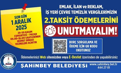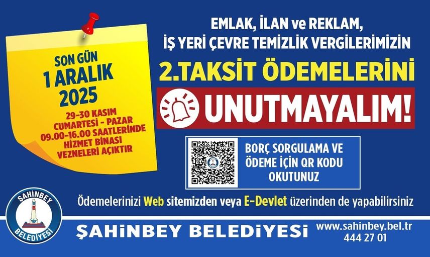 Şahinbey Belediyesi, 2025 yılı Emlak Vergisi, İş Yeri Çevre Temizlik Vergisi ve İlan ve Reklam Vergisi borçlarının ikinci taksit ödemeleri için son tarihin 1 Aralık 2025 Pazartesi olduğunu duyurdu.