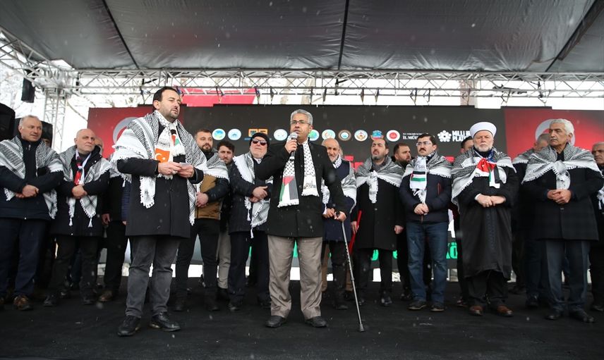 Katılımcılar, ellerinde Türk ve Filistin bayrakları ile dövizler taşıyarak, mitingin gerçekleştirileceği alana kar altında yürüdü. Platformda mehteran gösterisinin ardından Kur'an-ı Kerim okundu.