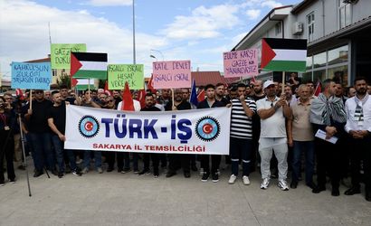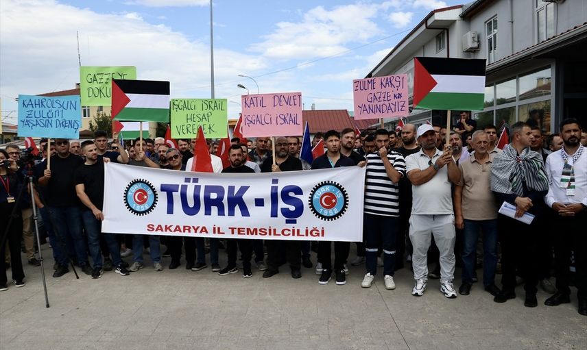 TÜRK-İŞ üyeleri, ellerinde Türk ve Filistin bayraklarıyla TÜRASAŞ Sakarya Bölge Müdürlüğü önünde bir araya geldi. Toplanan grup, Gazze'ye insani yardım ulaştırmak amacıyla yola çıkan Küresel Sumud Filosu'na yönelik saldırıları protesto etti.