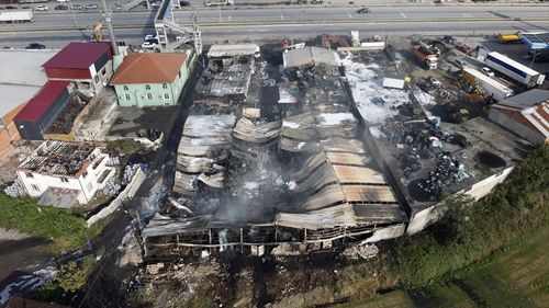Sakarya'da kauçuk fabrikasında çıkan yangın 4 saatte söndürüldü, 5 iş yeri zarar gördü.