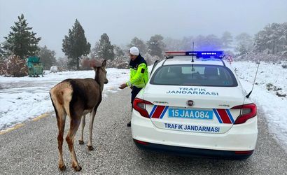 Burdur'daki Salda Gölü çevresindeki ormana salınan kızıl geyikler, karda besin ararken görüntülendi. Burdur Valiliği de sosyal medya hesaplarından bölgede görev yapan jandarma ekibinin karşılaştığı kızıl geyiğin görselini paylaştı.