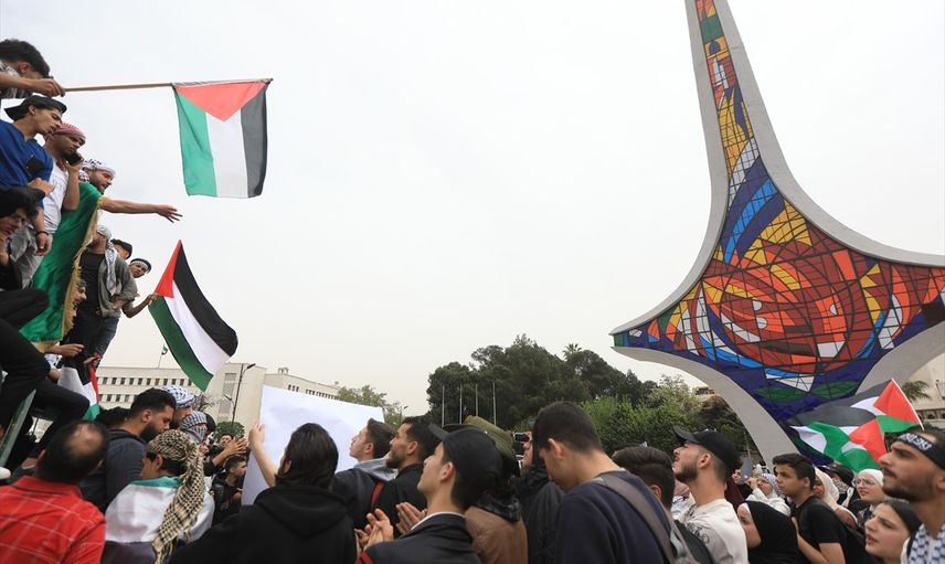 Suriye’nin başkenti Şam’da, yüzlerce kişi, İsrail'in Filistin'e yönelik devam eden saldırılarını protesto etmek için Emevi Meydanı'nda toplandı. Göstericiler, Şam’ın çeşitli mahallelerinden gelerek büyük bir kalabalık oluşturdu.