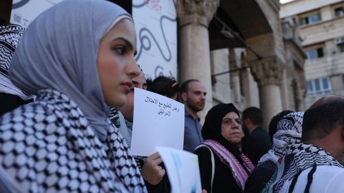 Şam'da Hicaz Meydanı'nda toplanan göstericiler, Küresel Sumud Filosu'na destek sundu; sloganlar ve çok dilli dövizlerle Gazze ve diasporadaki Filistinlilerin dayanışması vurgulandı.