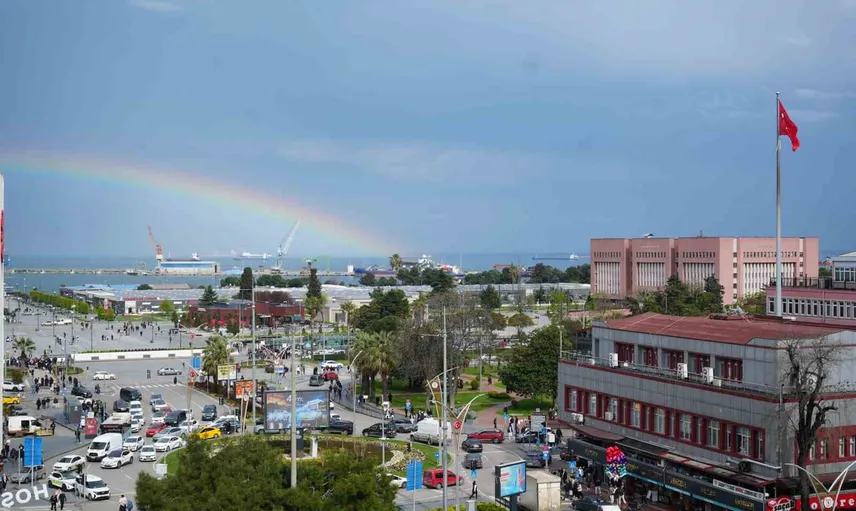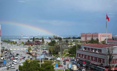 Samsun'da öğleden sonra etkili olan kısa süreli yağışın ardından deniz üzerinde beliren gökkuşağı, sahil hattında dikkat çeken bir manzara oluşturdu.
