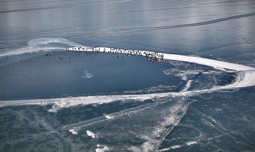 Kısmen donan gölde yaban ördekleri ve balıkçıllar, beslenme çabası içinde görülüyor. Havanın soğumasıyla birlikte, göl çevresinde oluşturduğu güzellikler dron ile görüntülendi.