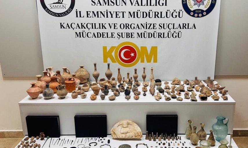 Samsun'un Atakum ilçesinde tarihi eser kaçakçılarına yönelik operasyonda bir şüpheli gözaltına alındı. Aramada, tarihi eser niteliğinde 80 pişmiş topraktan figür, 51 pişmiş topraktan testi, 21 bronz iğne, 7 taş yüzük, 10 bileklik, 8 cam testi, 3 balta ucu, 2 hac, 70 çeşitli tarihi obje ile 73 sikke ele geçirdi.