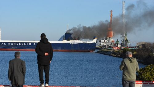Samsun Limanı'nda 'Firuze G.' isimli kuru yük gemisinde çıkan yangına müdahale ediliyor.