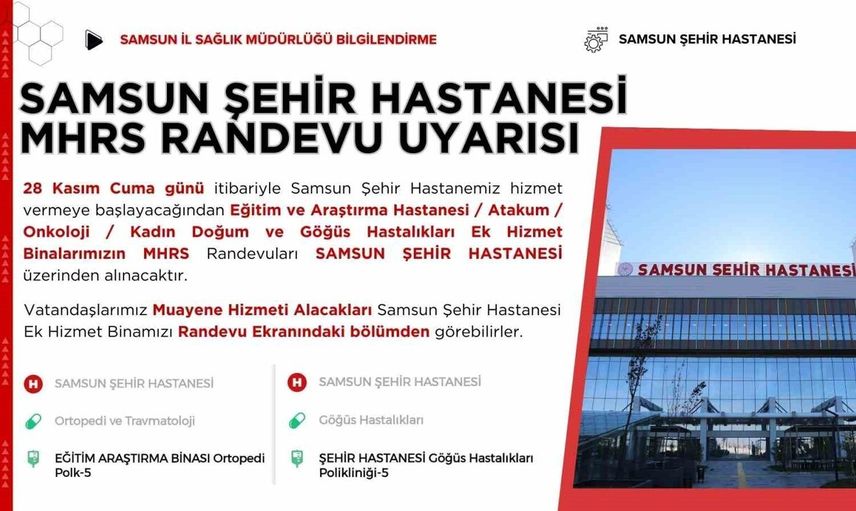 Samsun İl Sağlık Müdürlüğü, Samsun Şehir Hastanesi’nde hizmete başlayacak olan Göğüs Hastalıkları Kliniği için MHRS randevu sistemine ilişkin önemli bir duyuru yayımladı.