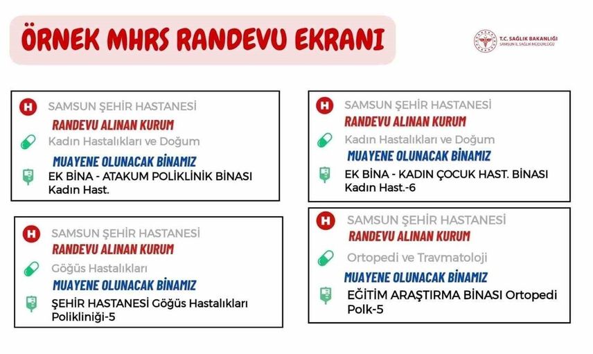 Açıklamanın kapanışında şu ifadelere yer verildi: "Bu nedenle vatandaşlarımızın mağduriyet yaşamaması için Samsun Şehir Hastanemiz üzerinden muayene randevusu aldıktan sonra MHRS randevu ekranındaki bölümden muayeneye gidecekleri hizmet binasını kontrol etmeleri ve muayene için bu binamıza gitmeleri büyük önem arz etmektedir. Kamuoyuna saygıyla duyurulur."