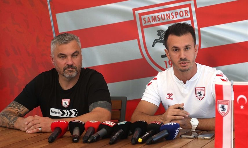 Trendyol Süper Lig ekiplerinden Samsunspor'un teknik direktörü Thomas Reis (solda),Nuri Asan Tesisleri'nde düzenlediği basın toplantısında, açıklamalarda bulundu.