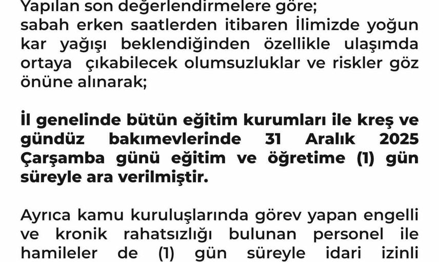 Yapılan son değerlendirmelere göre; sabah erken saatlerden itibaren ilimizde yoğun kar yağışı beklendiğinden özellikle ulaşımda ortaya çıkabilecek olumsuzluklar ve riskler göz önüne alınarak; il genelinde bütün eğitim kurumları ile kreş ve gündüz bakım evlerinde 31 Aralık 2025 Çarşamba günü eğitim ve öğretime 1 gün süreyle ara verilmiştir.