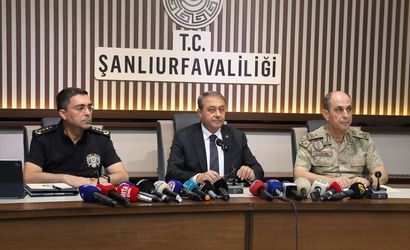 Şanlıurfa Valisi Hasan Şıldak (ortada), İl Emniyet Müdürü Atilla Aksoy (solda) ve Şanlıurfa İl jandarma Komutanı Tuğgeneral Ali Naci Aldemir (sağda) ile asayiş ve güvenlik konularıyla ilgili gazetecilere açıklama yaptı.
