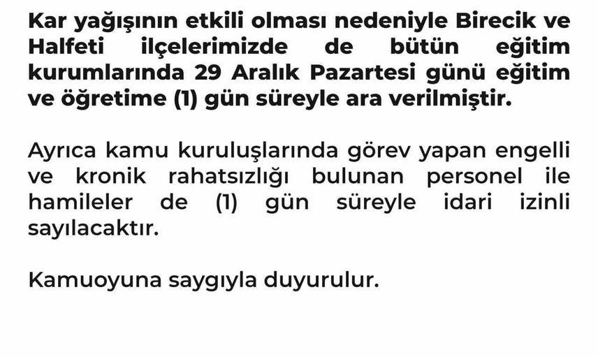 Sabaha karşı kar yağışının Halfeti ve Birecik'te de yoğun şekilde görülmesi üzerine valilik, bu iki ilçede de okulların bir günlüğüne tatil edildiğini bildirdi.