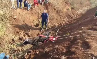 Şanlıurfa'nın Eyyübiye ilçesine bağlı Uğurlu Mahallesi'nde bir ineğin tahliye kanalına düşerek çamura saplanması sonucu kurtarma operasyonu gerçekleştirildi.