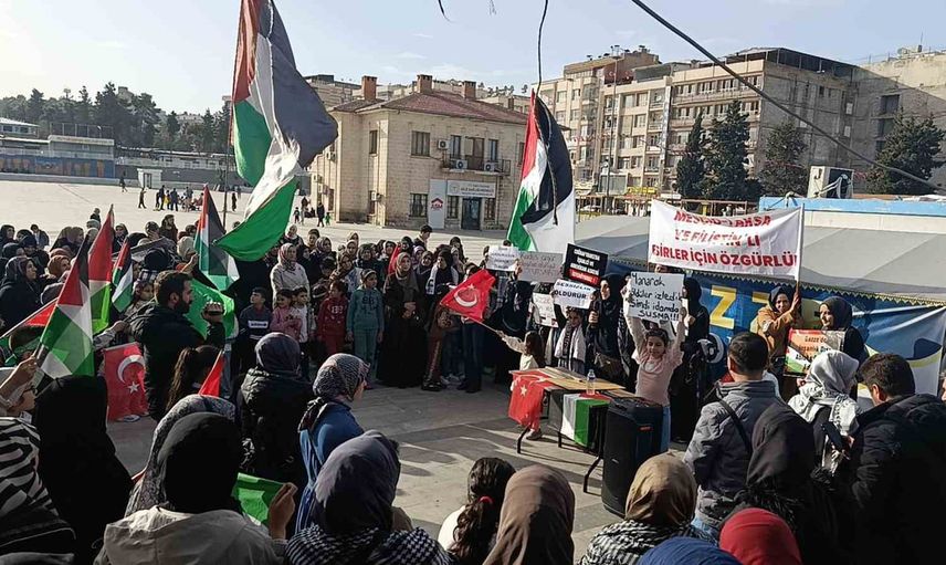 Şanlıurfa Topçu (Rabia) Meydanı'nda toplanan yüzlerce kadın, ellerinde Filistin ve Türk bayraklarıyla Gazze halkına destek verdi. Grup, Gazze için dua edip yaptıkları basın açıklamasıyla İsrail'in idam yasasına tepki gösterdi.