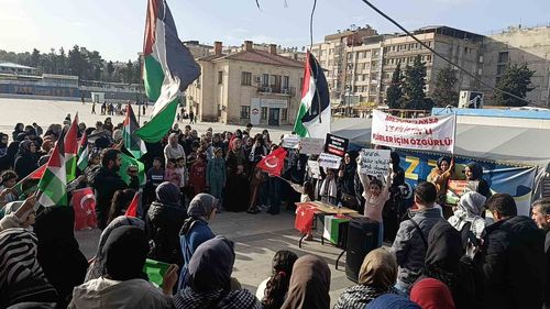 Şanlıurfa'da yüzlerce kadın Topçu (Rabia) Meydanı'nda toplanıp Gazze'ye destek vererek İsrail'in idam yasasını protesto etti, uluslararası müdahale çağrısında bulundu.