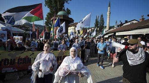Saraybosna'da yüzlerce kişi, İsrail'in Gazze'ye yönelik saldırılarını protesto etmek için sokaklara döküldü.