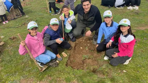 Manisa'nın Sarıgöl ilçesinde Nevruz Bayramı ve Orman Haftası kapsamında Dadağlı Mahallesi'nde 400 fıstık çamı fidanı dikildi; protokol, öğretmen ve öğrenciler katıldı.