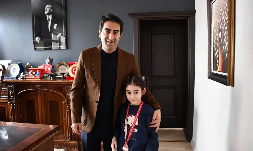 Kaymakam Enis Aslantatar, turnuvada öne çıkan öğrenciler Gökçe Zehra Tuluğ, Esma Zeynep Yalçın ve Tusem Lina Aksu'yu makamında kabul etti. Aslantatar, öğrencilere madalyalarını takdim ederek başarılarını tebrik etti ve çalışma azimleri için destek verdi.