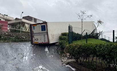 Sarıyer Maden Mahallesi Yunus Emre Caddesi'nde yağışın etkisiyle kayganlaşan yolda, sürücüsünün ismi öğrenilemeyen 67 EK 377 plakalı tır virajı alamayarak kontrolden çıktı ve çocuk parkının demir korkuluklarının bulunduğu şarampole devrildi.