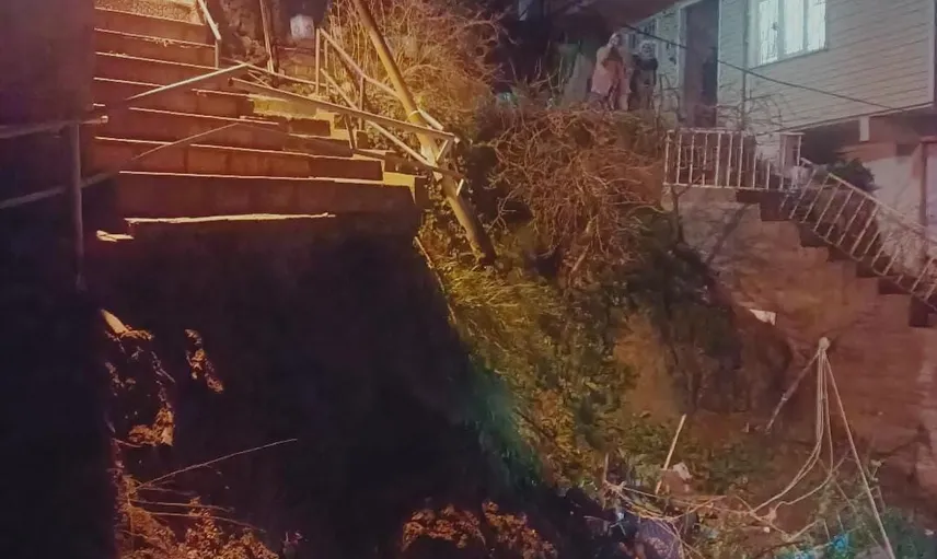 Sarıyer Rumeli Kavağı'nda yağış nedeniyle bina yanındaki merdiven çöktü