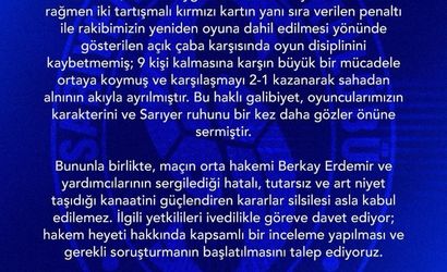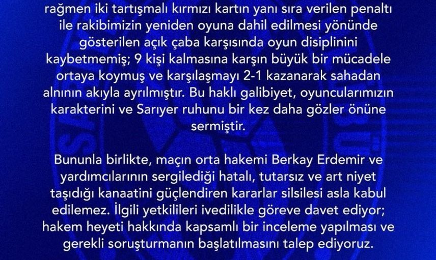 Talep edilen adım: Sarıyer, maçta görev yapan hakem heyeti hakkında kapsamlı bir inceleme yürütülmesini ve gerekli soruşturmanın başlatılmasını resmi makamlar nezdinde talep ettiğini bildirdi.
