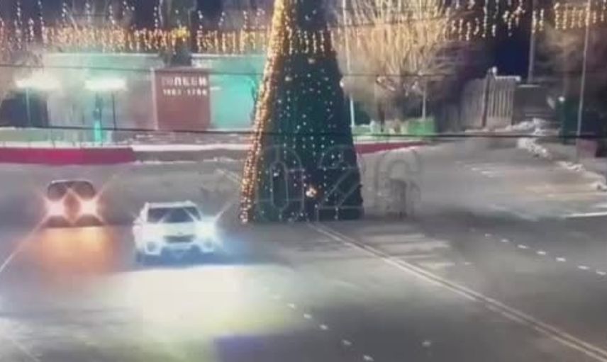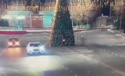 Kazakistan’da kent meydanında drift yapan sürücü, çarptığı 12 metrelik yılbaşı ağacını devirdi.