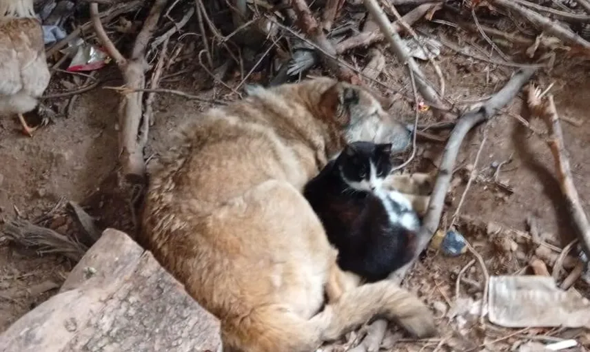 Genellikle birbirine düşman olarak bilinen bu iki hayvan, soğuktan korunmak için adeta koyun koyuna yatarken görüntülendi. Olayı gören vatandaşlar, duygusal anları kaydetmek üzere cep telefonlarıyla fotoğraf çekti.