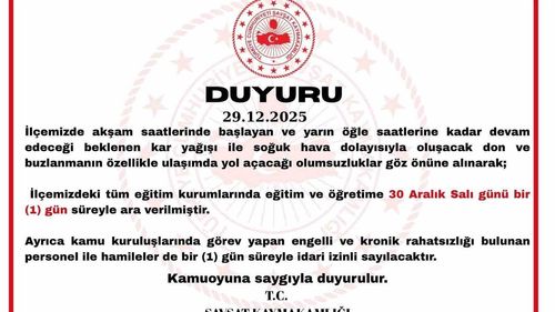 Şavşat Kaymakamlığı, 30 Aralık Salı ilçede beklenen kar, don ve buzlanma nedeniyle tüm eğitim kurumlarında eğitime bir gün ara verildiğini duyurdu.