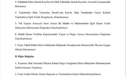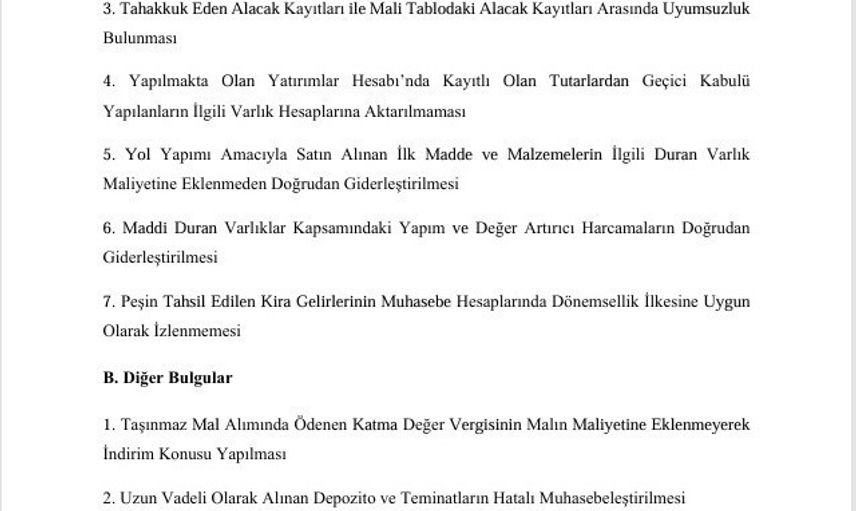 Raporda, belediyeye Cumhurbaşkanlığı tasarruf genelgelerine uyulması, ruhsatsız iş yerlerinin tespit edilerek kayda alınması ve sosyal yardım uygulamalarının mevzuata uygun şekilde, dağıtım kayıtlarıyla belgelenmesi önerildi.