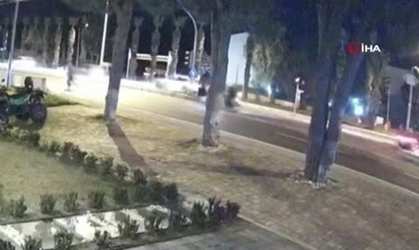 Çevredeki bir iş yerine ait güvenlik kamerasına yansıyan görüntülerde, motosikletin yolun karşısına geçmeye çalıştığı sırada otomobilin yüksek hızla çarptığı ve çarpmanın etkisiyle motosiklet ile sürücüsünün savrulduğu görülüyor.