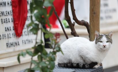 Gaziantep’te bulunan Asri Mezarlık Şehitliğinden hiç ayrılmayan bir sokak kedisi, mezarlığı ziyaret eden ailelere eşlik ediyor.
