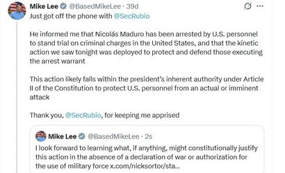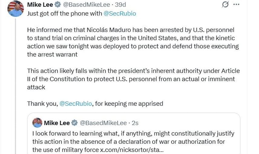 ABD'Lİ CUMHURİYETÇİ SENATÖR MİKE LEE, VENEZUELA'YA GERÇEKLEŞTİRİLEN SALDIRIYLA İLGİLİ ABD DIŞİŞLERİ BAKANI MARCO RUBİO İLE TELEFONDA GÖRÜŞTÜĞÜNÜ BELİRTEREK, "(RUBİO) BANA NİCOLAS MADURO'NUN CEZAİ SUÇLAMALARLA ABD'DE YARGILANMAK ÜZERE ABD PERSONELİ TARAFINDAN TUTUKLANDIĞINI VE BU GECE GÖRDÜĞÜMÜZ OPERASYONUN TUTUKLAMA EMRİNİ UYGULAYANLARI KORUMAK VE SAVUNMAK İÇİN GERÇEKLEŞTİRİLDİĞİNİ BİLDİRDİ" İFADELERİNİ KULLANDI.