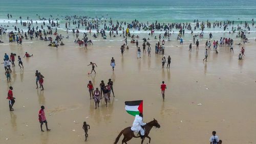 Senegal'in Dakar kentinde, performans sanatçısı Thierno Gueye, Filistin'e destek amacıyla sahilde atlı bir gösteri gerçekleştirdi.