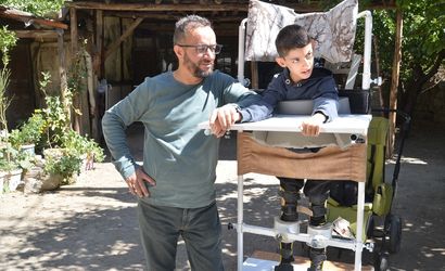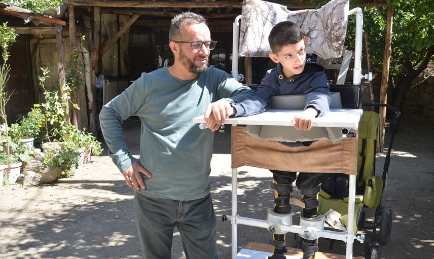 Hakkari'nin Yüksekova ilçesinde yaşayan demir doğrama ustası Aydın Budak, serebral palsili (beyin felci) oğlunu, yaptığı "ayakta durma sehpası" ile gezdirerek mutlu olmasını sağlıyor.