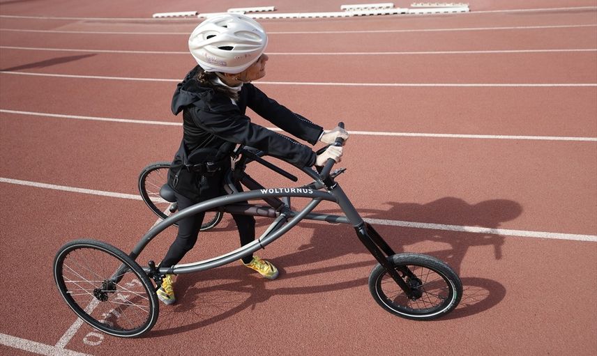 Binicilikte "tek para at terbiyecisi" unvanı sahibi 34 yaşındaki serebral palsili sporcu Canan Doğan (solda), üç tekerlekli bisiklet koşusuyla başladığı atletizmde ilk yarışını tamamlamayı başardı.