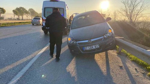 Serik D-400'de iki otomobil çarpıştı: Araç demir bariyerde asılı kaldı, yaralanan yok