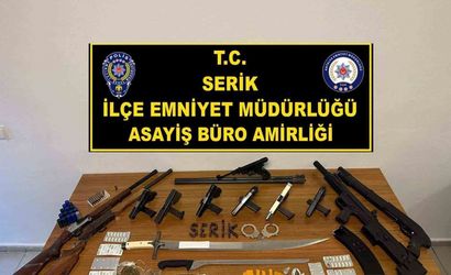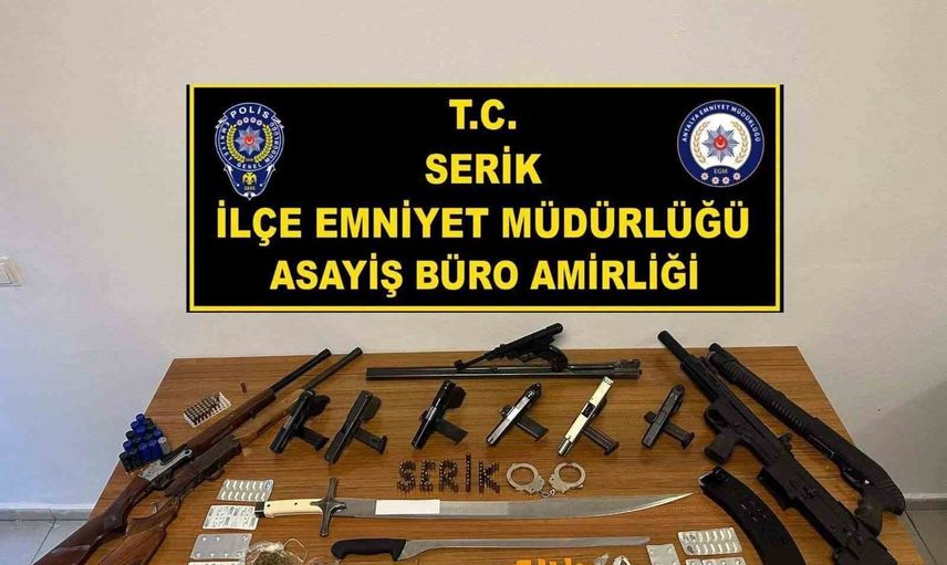 ANTALYA’NIN SERİK İLÇESİNDE POLİS EKİPLERİNCE GERÇEKLEŞTİRİLEN EŞ ZAMANLI OPERASYONDA, ÇOK SAYIDA RUHSATSIZ SİLAH, UYUŞTURUCU MADDE VE KESİCİ ALET ELE GEÇİRİLDİ. OPERASYONDA 16 ŞÜPHELİ GÖZALTINA ALINDI.