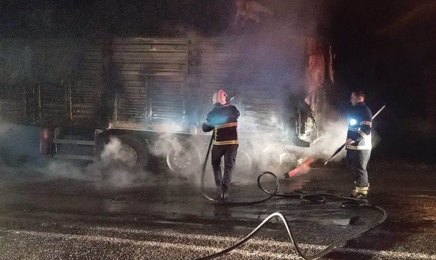 Siirt'te seyir halindeki buğday yüklü tır alev alev yandı. Ekiplerin çalışmasıyla söndürülen yangında, tır ve dorsedeki buğday kullanılamaz hale geldi.