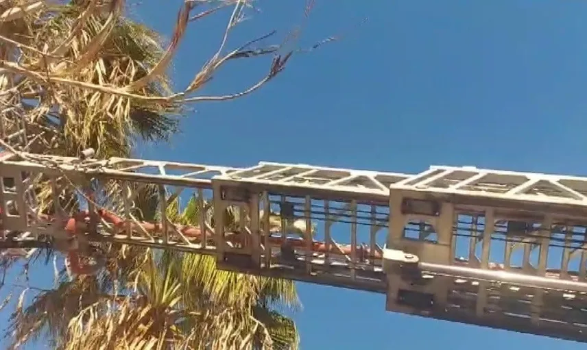 Silifke'de palmiye tepesinde mahsur kalan sokak kedisi itfaiye tarafından kurtarıldı